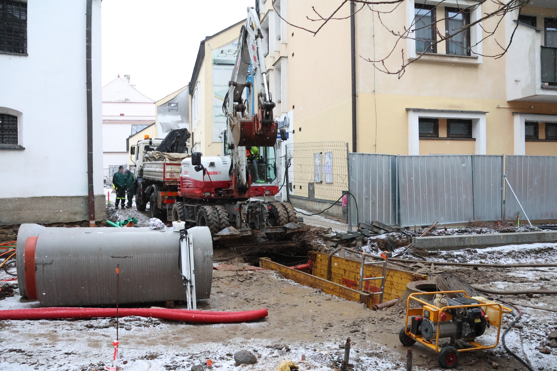 Stavbaři dokončili propojení kanalizace U Bašty a přesunuli se mezi kostel a prodejnu nábytku.