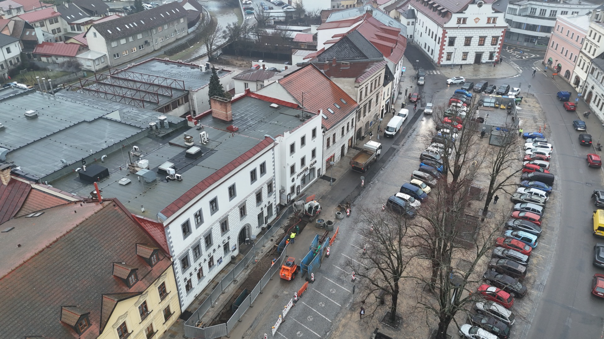 V příštím týdnu čeká řidiče na dolní straně náměstí výraznější omezení parkování než dosud. Rekonstrukce kanalizace totiž pokročila k Jupiter clubu, kde kanalizační vedení vybočuje od hrany chodníku do vozovky.